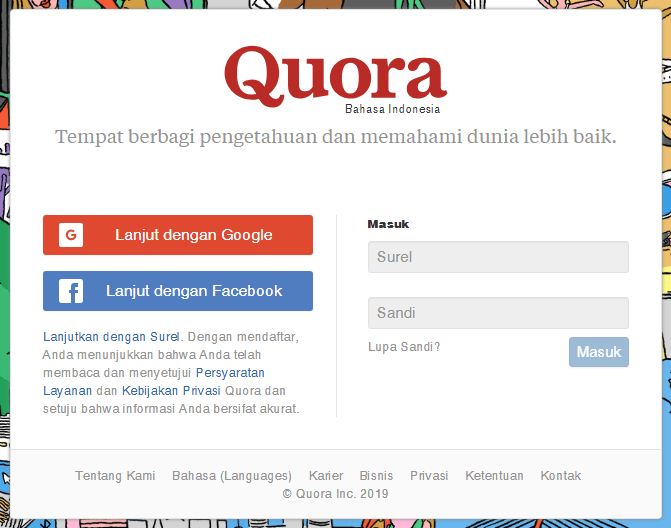 Buka quora.com (Inggris) atau id.quora.com (Indonesia). Anda bisa langsung login menggunakan akun Gmail atau Facebook seperti halnya di Medium.