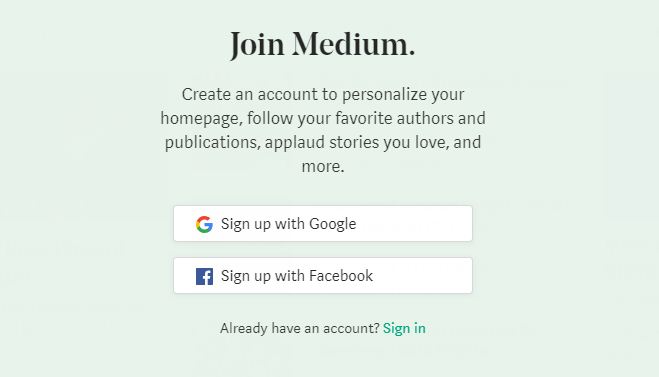 Untuk membuat blog di medium, buka medium.com dan klik Get Started di kanan atas, Anda bisa langsung login menggunakan Gmail atau Facebook.