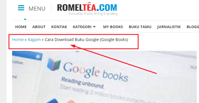 Ini contoh breadcrumbs di romeltea.com (Home >> Ragam >> Cara Download Buku Google)