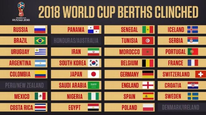 Sebanyak 32 negara dipastikan menjadi peserta Piala Dunia 2018 (FIFA World Cup 2018) di Rusia.