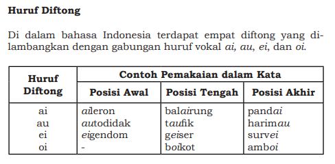 Pada EYD, huruf diftong hanya tiga yaitu ai, au, oi, sedangkan pada EBI, huruf diftong ditambah satu yaitu ei (misalnya pada kata geiser dan survei). Kini ada empat diftong dalam bahasa Indonesia, yakni ai, au, ei, dan oi.