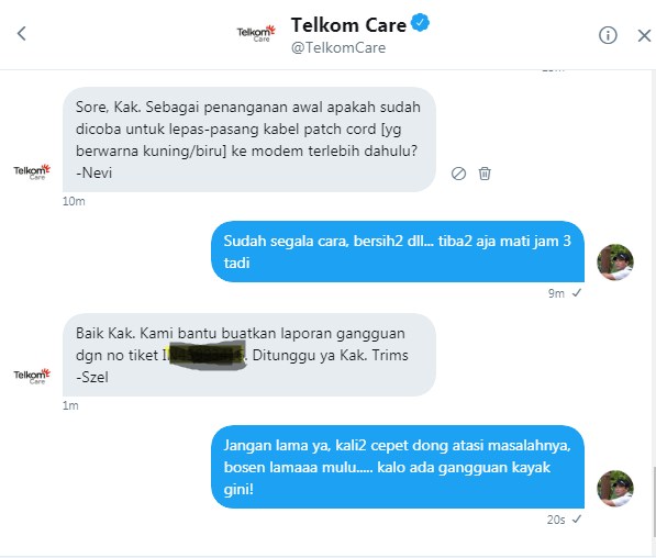 - Sampaikan keluhan via Twitter @TelkomCare (Ini yang biasa saya lakukan)
