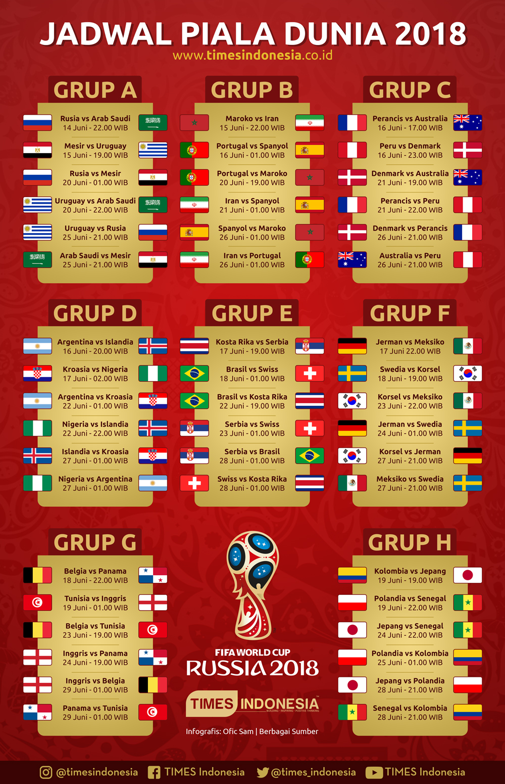 Jadwal Piala Dunia 2018. Siaran langsung pertandingan Piala Dunia dapat disaksikan di TransTV, Trans7, dan K-Vision.*