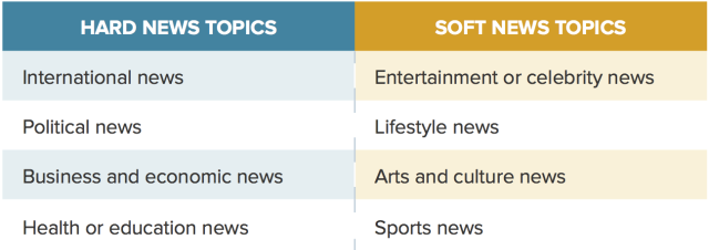 “Hard news generally refers to up-to-the-minute news and events that are reported immediately, while soft news is background information or human-interest stories.