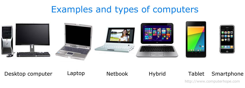 Jenis-Jenis Komputer cukup banyak. Untuk kepentingan praktis, kita bagi saja menjadi tiga jenis komputer, yakni Komputer Meja (Dekstop), Komputer Portable (PC, Laptop, Notebook) dan Netbook (Laptop ukuran kecil), sebagaimana dalam gambar dari laman Computer Hope berikut ini: