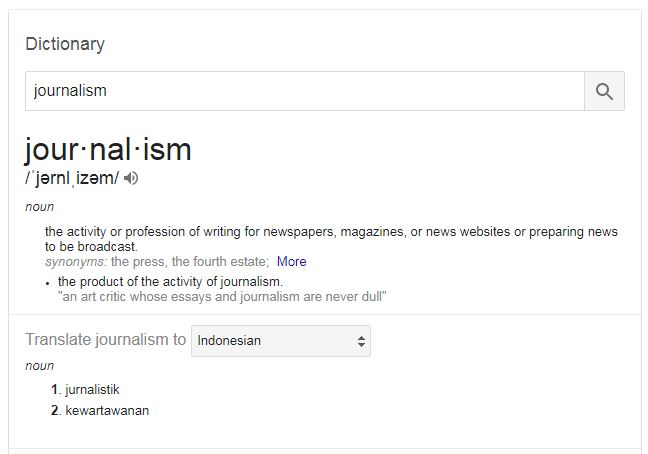 Masih secara bahasa, Google mengartikan jurnalistik sebagaimana dalam screenshot berikut ini: