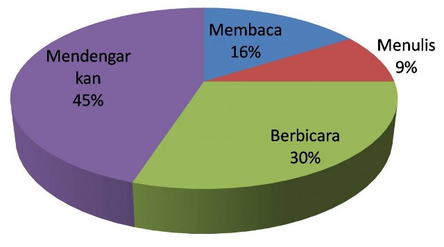 Dari 70% waktu komunikasi ini, kita menghabiskan 16% waktu untuk membaca, 9% untuk menulis, 30% untuk berbicara, dan 45% untuk mendengarkan (Berlo [1961] dikutip Soleh Soemirat & Asep Suryana dalam “Falsafah dan Konsep-konsep Dasar Komunikasi Persuasif“).