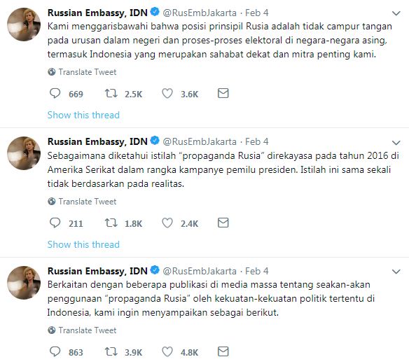 Karena membawa-bawa nama Rusia, pihak Rusia bereaksi. Istilah ‘propaganda Rusia’ itu ditepis lewat Kedutaan Besar Rusia di Indonesia.