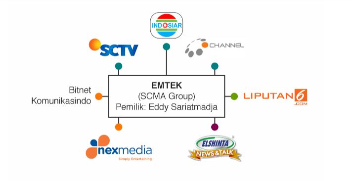 Pemilik: Eddy Sariatmadja. Grup Elang Mahkota Teknoligi (Emtek) ini terdiri dari SCTV, Indosiar, O-Channel, Liputan6.com, Bola.com, Bitnet Komunikasindo, Nexmedia, dan Radio Elshinta.