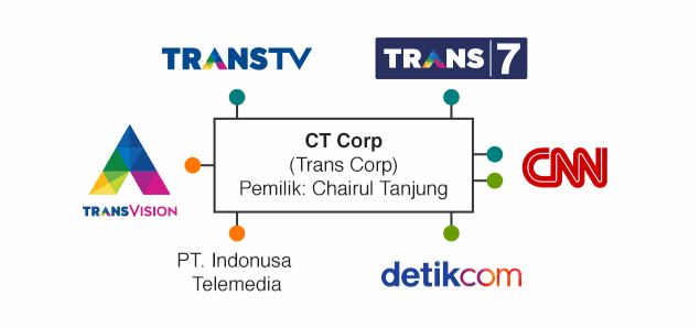 Pemilik: Chairul Tanjung. Korporasi media ini terdiri Trans TV, Trans7, Trans Vision, PT Indonusa Telemedia, CNN Indonesia, dan Detik.com. Selengkapnya: CT Corp.