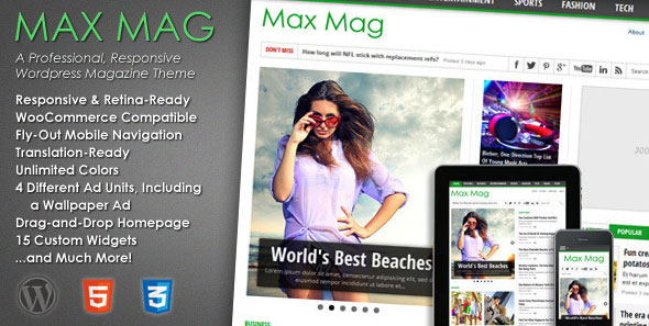A feature-rich, professional media and magazine theme. Max Mag is fully-responsive, retina-ready and Compatible with WooCommerce and bbPress. It also includes a “sticky” menu bar, a slider on each category page, 5 different ad units (including a wallpaper and mobile ad), a drag-and-drop homepage, 16 custom widgets, secondary feature headlines, SEO friendly and so much more!