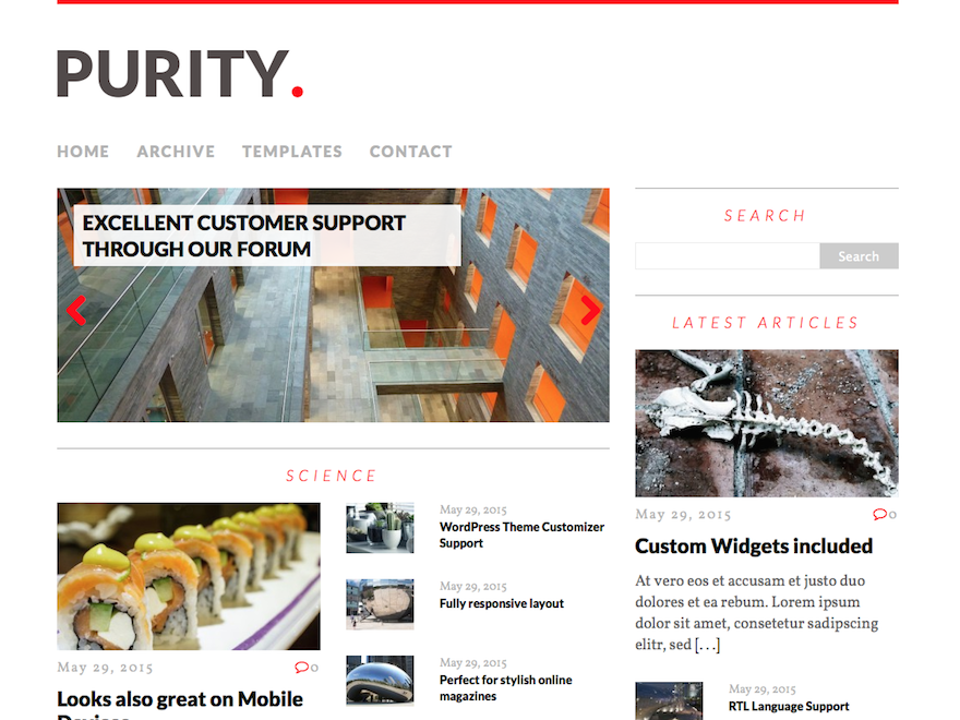 MH Purity lite is a clean and modern WordPress magazine theme which is perfectly suited for stylish online magazines, dynamic news websites and fancy blogs. This magazine WordPress theme can be configured within a few minutes and the theme options are fully integrated in the WordPress Theme Customizer.